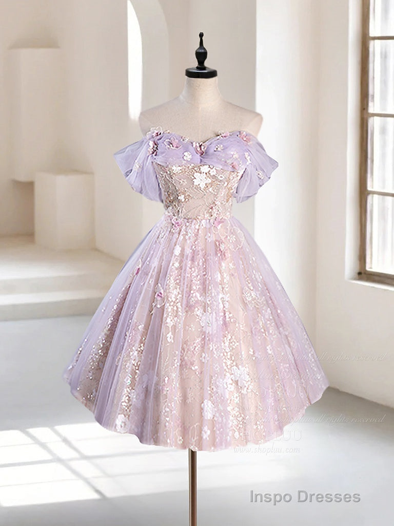 A-Line Off Shoulder Tulle Lace Purple Short Prom Dress, Cute Purple Homecoming Dress