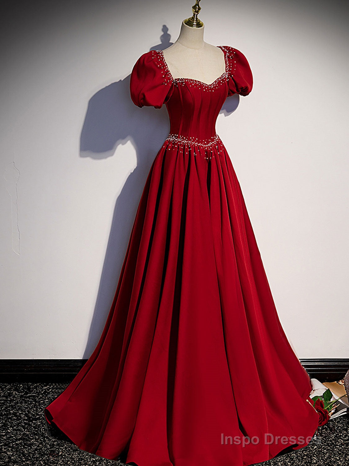Burgundy Satin Beads Long Prom Dresses, Burgundy Long Formal Dresses