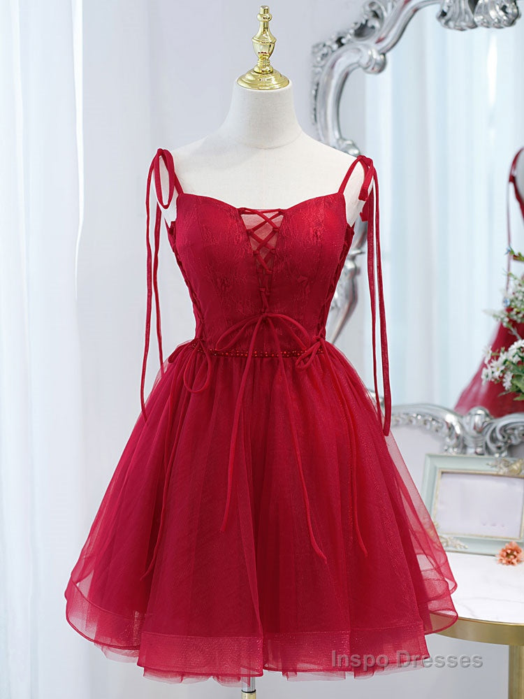 Cute Burgundy Tulle Lace Short Prom Dress, Lace Burgundy Puffy Homecoming Dress