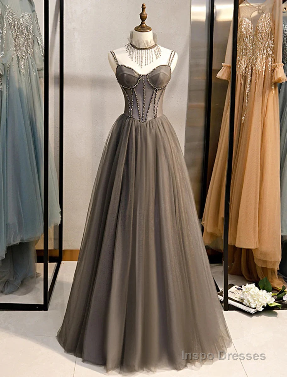 Gray A-Line Prom Dresses Open Back Dress Formal Wedding Party Floor Length Sleeveless Spaghetti Strap Tulle with Pleats Crystals