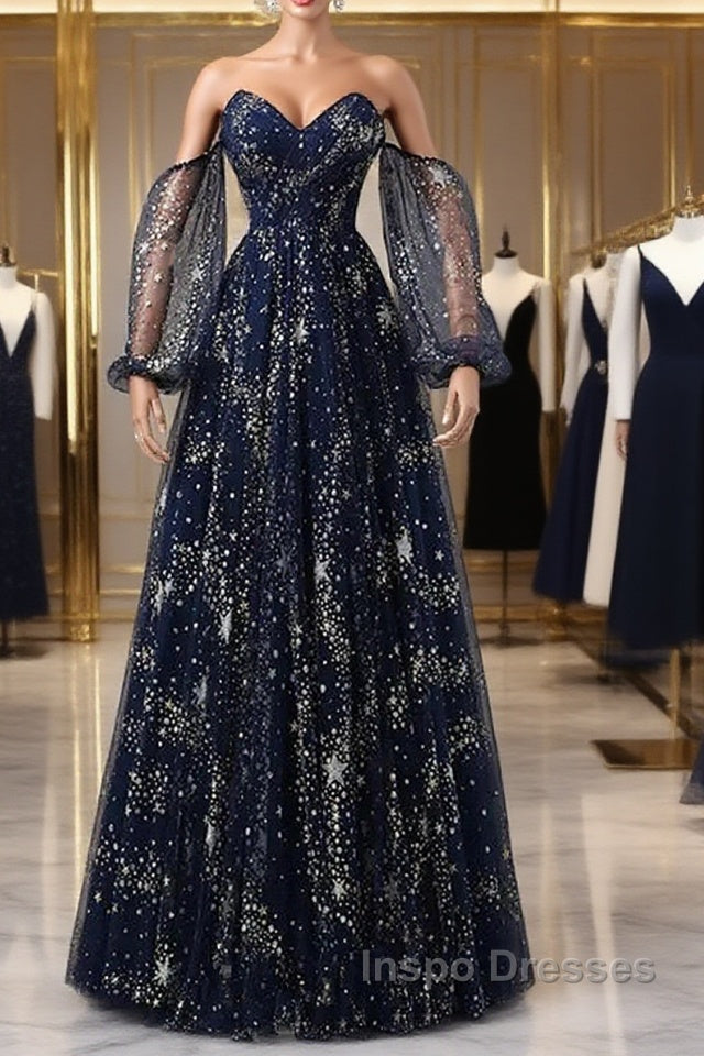 Navy Blue Tulle A-Line Long Party Dress Evening Dress, Navy Blue Long Evening Prom Dress
