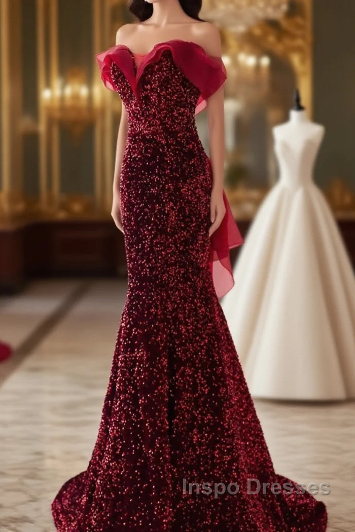 Wine Red Sequins Mermaid Long Party Dress, Off Shoulder Sweetheart Evening Prom Dress